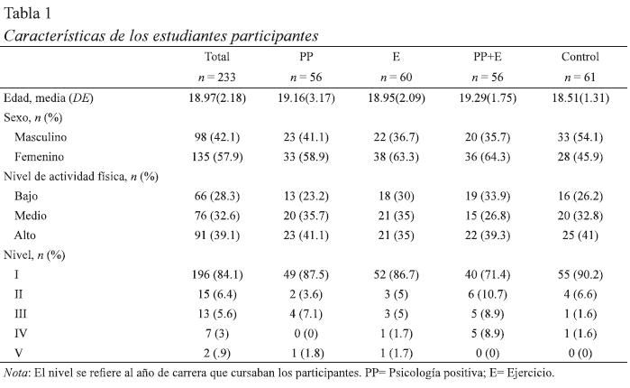 Las características de los participantes se detallan en la tabla 1. Los grupos presentan la tendencia a estar conformados en su mayoría por mujeres (con la excepción del grupo control) y un alto porcentaje se encuentra en el primer nivel (año) de carrera. La mayoría de los participantes reportan niveles de actividad física moderados y altos. No hubo diferencias significativas entre grupos para alguna de las variables.