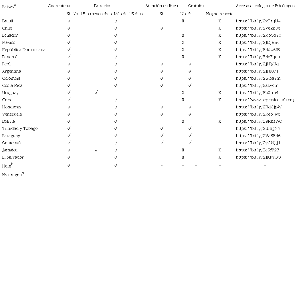 La mayoría de países en Latinoamerica han establecido cuarentena durante un periodo de más de 15 días. Pero, menos de la mitad de estos países han habilitado atención en línea gratuita por medios telefónicos y digitales. Los respectivos colegios de psicólogos y sus agremiados en Colombia, Perú, Argentina, Costa Rica, Honduras, Venezuela, Trinidad y Tobago, Paraguay y Guatemala han puesto a disposición la atención psicológica y las recomendaciones para el cuidado de la salud mental frente a la cuarentena como medida de protección ante la COVID-2019 (ver tabla 1). Pese a esta disposición de algunos países, aún se identifica la ausencia de coordinación de la mayoría de los colegios profesionales de psicólogos de los países de la región para brindar acciones dirigidas en atención hacia el cuidado de la salud mental y resulta necesario que estas instituciones implementen soportes preventivos y de intervención debido a los efectos psicológicos que podrían registrarse.