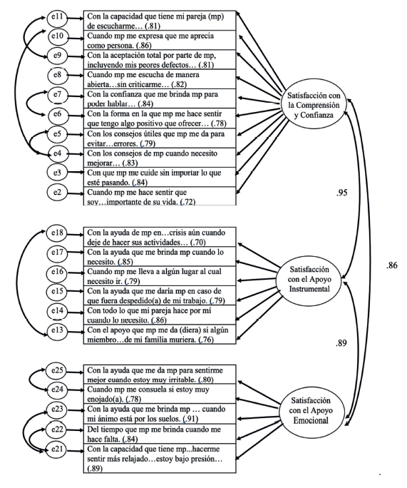 Como es evidente, los contenidos de los factores obtenidos constatan el hallazgo de correlaciones altas reportadas en la figura 1, porque la satisfacción con la comprensión y la confianza que siente la persona participante (quien recibe el apoyo) fortalece la aceptación y el valor dentro de su relación para su pareja (Guerrero et al., 2018). Ello le permite gozar del apoyo instrumental y emocional, que se contribuyen mutuamente; es decir, en la medida que se siente satisfacción con un aspecto se tiene con los otros aspectos. Aunado a esto, los factores derivados muestran “tonalidades” del constructo en el contexto de la relación de pareja, que si bien no aparecían en la versión original de Sarason et al. (1983), ni en la escala mexicana de Cienfuegos-Martínez y Díaz-Loving (2011), porque ambas son escalas unidimensionales-, aquí están bien definidas y muestran cualidades psicométricas aceptables.