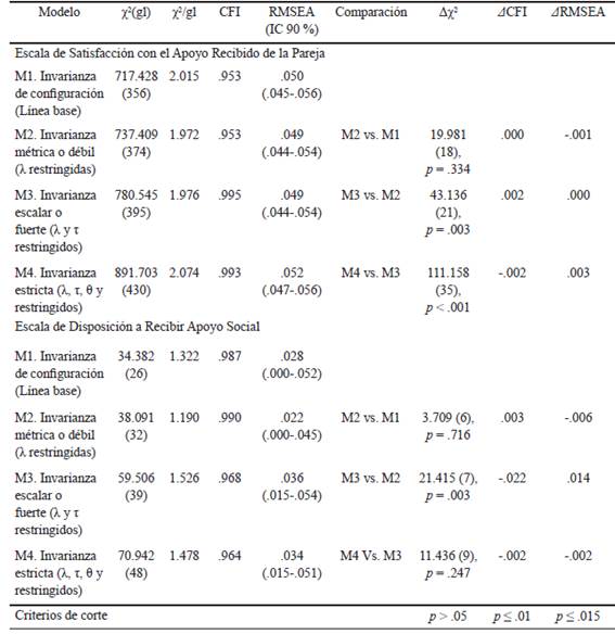 Respecto al tercer objetivo que analizó la invarianza factorial de las escalas, al evaluar el grado de igualdad de su estructura entre hombres y mujeres, se encontró que, de acuerdo con los criterios recomendados por Cheung y Rensvold (2002), en la ESAReP los modelos puestos a prueba fueron comparables cuando las cargas factoriales se mantenían invariantes a través del sexo, pero cumplieron solo dos de los tres criterios en los modelos de invarianza escalar y estricta. En relación con la invarianza para la EDaRA, las pruebas efectuadas mostraron equivalencia de la estructura factorial, excepto en dos de los parámetros del modelo de invarianza escalar. Por tanto, en ambas escalas se asumiría una invarianza métrica parcial (Dimitrov, 2010), la cual sugiere que los puntajes de las escalas podrían ser equivalentes en ambos grupos. Estos resultados se apoyan en la investigación de Neff y Karney (2005), donde refieren similitud entre los miembros de la pareja al respecto del apoyo intercambiado entre ellos. Los estudios que reportan diferencias son respecto a la recepción, la solicitud y el estilo de apoyo (ver Belle, 1982; Pasch et al., 1997; Tannen, 1990; Thoits, 2011; Verhofstadt et al., 2007), no respecto a la satisfacción ante el apoyo recibido de la pareja. Dicho tema se aborda en esta investigación.