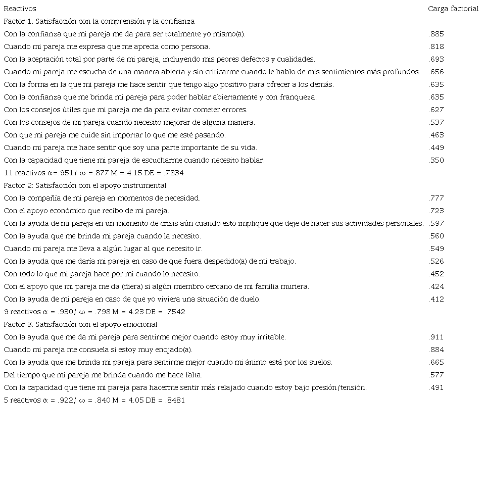 Los resultados mostraron que los 31 ítems diseñados discriminaron; en consecuencia, se realizó un AFE de ejes principales con rotación oblicua (tipo promax), porque originalmente la escala mostró unidimensionalidad y se seleccionaron solo aquellos que registraron cargas factoriales iguales o superiores a .40 (excepto el reactivo “Con la capacidad que tiene mi pareja de escucharme cuando necesito hablar” cuya carga fue de .350). Dicho análisis evidenció un índice KMO = .973 y la Prueba de Esfericidad de Bartlett = 8154.932, gl = 300, p = .001, que indica la adecuación de la muestra, además de reflejar la existencia de tres factores con valores superiores a 1 que explicaron el 62.05% de la varianza y con coeficientes de confiabilidad α = .979 y ω = 859 (ver tabla 1). Cabe señalar que, en este proceso, seis reactivos no obtuvieron cargas suficientemente altas (< .40) para permanecer en su factor.
