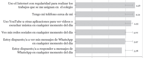 Intensidad de uso de internet. Esta variable se evaluó por medio de 7 ítems y se empleó como una variable continua. Se midió a través de una escala Likert de 5 puntos entre “Nunca” y “Siempre” para preguntas sobre la cercanía con el teléfono celular y frecuencia de uso de Internet para ver redes sociales y videos/música. Por ejemplo, “Tengo mi teléfono cerca de mí”, “Estoy dispuesto/a responder a mensajes de WhatsApp en cualquier momento del día.” Respecto a la fiabilidad de la escala, esta obtuvo un alfa de Cronbach de .82.