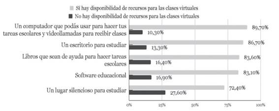 En cuanto a la disponibilidad de los recursos para las clases virtuales, donde las respuestas se ubicaron en un porcentaje de 0 a 100, se halló que el recurso con el que más dispone el estudiantado es la computadora para hacer tareas y videollamadas, con un porcentaje de 89.7%, seguido por un escritorio para estudiar, con un 86.7% y, en último lugar, con un 72.4% contar con un lugar silencioso para estudiar (ver figura 2).
