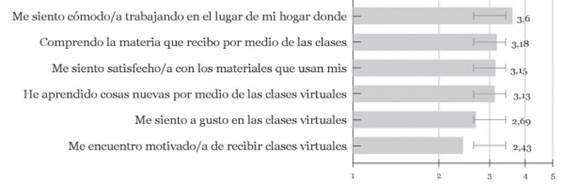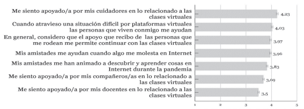 Respecto al apoyo percibido en las clases virtuales, se encontró un promedio de apoyo global de 27.5 y 35 la puntuación máxima posible, mientras que el promedio del ítem de autoeficacia hacia las clases virtuales fue de 4.21, con 5 como la puntuación máxima posible (ver figura 3 para la descripción de cada ítem).