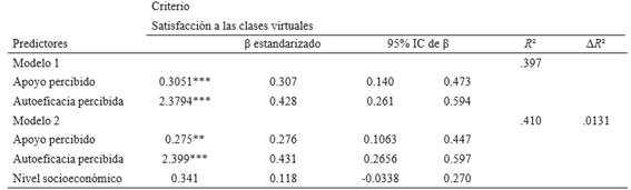 En un segundo modelo, se agregó el NSE a las variables predictoras anteriores, debido a que se correlacionó con la satisfacción de las clases virtuales, aunque con una significancia estadística menor que la encontrada en el caso de las variables psicosociales, r(128) = .2, p < .05. Así, al agregar el NSE como variable predictora, se obtuvo un segundo modelo que explica la satisfacción en el contexto de clases virtuales a partir del apoyo percibido, autoeficacia hacia las clases virtuales y NSE. Pero, este modelo no mejoró de manera estadísticamente significativa (p > .05) la robustez del anterior.