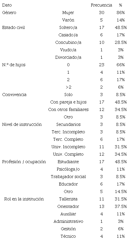 Del total de 35 trabajadores, el 86% eran mujeres y el 14% restante, varones. En términos genera- les, los participantes fueron en su mayoría mujeres, solteras, sin hijos, con una formación universitaria. Los datos sociodemográficos que se tomaron de los participantes se resumen en la tabla 1.