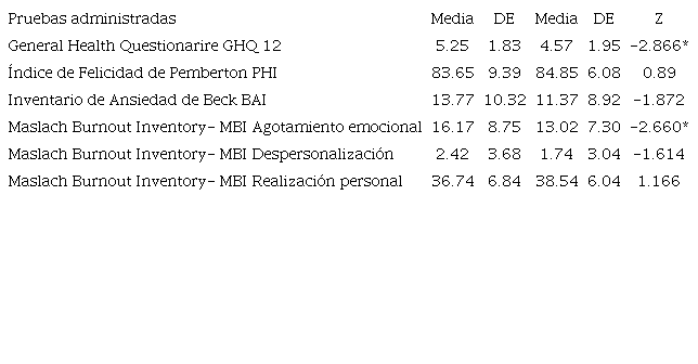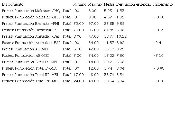 Por un lado, las mediciones pos test reportaron cambios cuantitativos en las otras variables en estudio, de manera tal que se observó un incremento del bienestar y de realización personal en el trabajo. Por otro lado, hubo una disminución en la severidad y gravedad de la ansiedad y despersonalización, aunque tales cambios no alcanzaron una significancia estadística.
