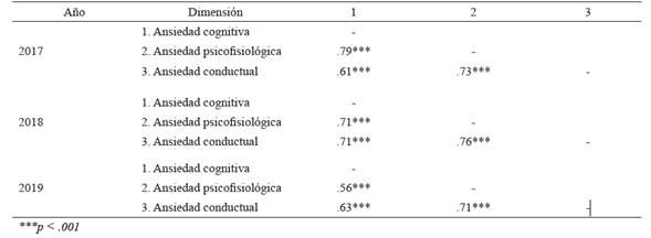 Respecto de la confiabilidad, las tres escalas presentan niveles altos para muestra chilena. Lagos et al. (2018) señalan alfas de Cronbach de .82, de .85 y de .82 para ansiedad cognitiva, psicofisiológica conductual, respectivamente. Por último, se obtuvo un nivel de fiabilidad de .93 para la puntuación total. Se catalogaron como confiables y representativas de las dimensiones medidas. Además, como una forma de dar cuenta de la estabilidad del cuestionario utilizado en la medición, se muestran las correlaciones entre las dimensiones para cada año. De este modo, se puede asumir que existe consistencia del instrumento a través del tiempo y que si existen diferencias se puede deber a lo reportado por los participantes. En la tabla 1, se observa que las dimensiones de la escala IAEB entre sí tienen correlaciones positivas y significativas al 1%.