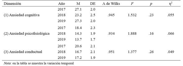 El puntaje de ansiedad cognitiva no se afecta a través de los años, F(2,153) = 1.53, p =.23, teniendo promedios entre 23 y 27 puntos; la ansiedad psicofisiológica tampoco se ve mayormente alterada, F(2,153) = 1.88, p = .16; asimismo, para la ansiedad conductual F(2,153) = 1.37, p = .26.