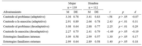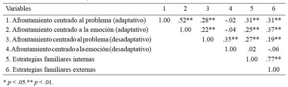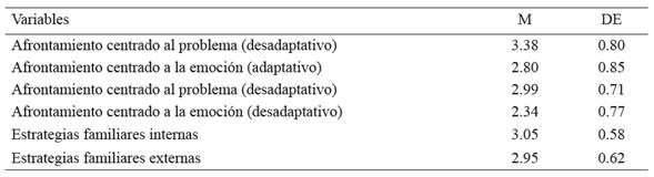 En la tabla 1 se identifica que el afrontamiento dirigido al problema (adaptativo) representa las estrategias mayormente utilizadas (M = 3.38; DE = 0.80). Además, las estrategias menos utilizadas se corresponden con el afrontamiento centrado a la emoción (desadaptativo) (M = 2.34; DE = 0.77). A nivel familiar, se observa que el afrontamiento familiar interno representa las estrategias mayormente utilizadas (M = 3.05; DE = 0.58) y las estrategias menos utilizadas corresponden al afrontamiento familiar externo (M = 2.95; DE = 0.62).