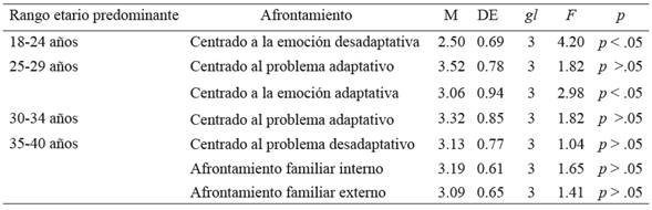 En la tabla 4 se observa a partir de un ANOVA de un factor diferencias estadísticamente significativas en el afrontamiento dirigido a la emoción (adaptativo), según rango etario (F = 2.98, p < .01). Se identificó una tendencia a favor del grupo de 25 a 29 años. Además, se detectaron diferencias estadísticamente significativas en el afrontamiento dirigido a la emoción (desadaptativo) (F = 4.20, p < .01). Se observó una tendencia a favor del grupo de 18 a 24 años.