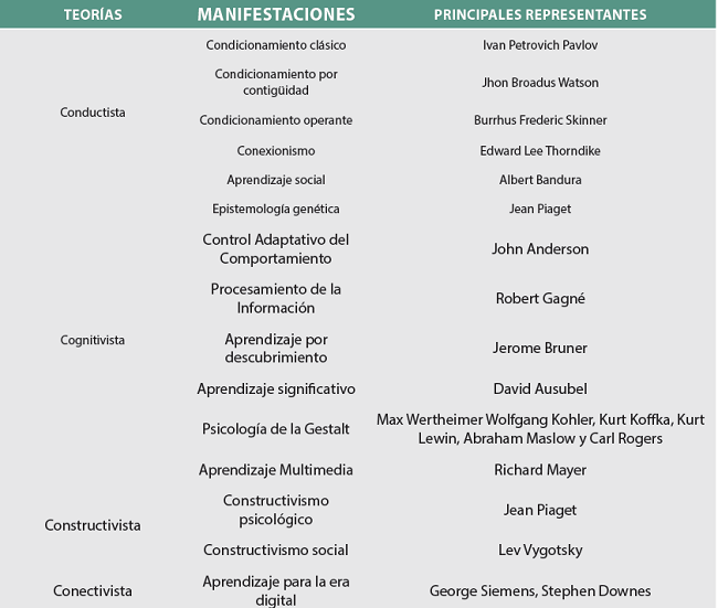 Existe una amplia variedad de clasificaciones que existen sobre las Teorías del Aprendizaje. La más comúnmente utilizada se establece en función de las corrientes o enfoques. Denominándose, entonces, a las teorías como conductista, cognitivista, constructivista y conectivista, que derivan en la complementación de unas con otras. (Ver Tabla 1)
