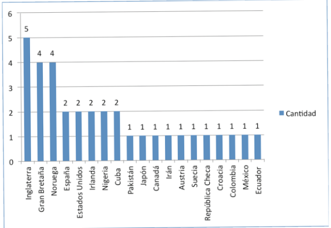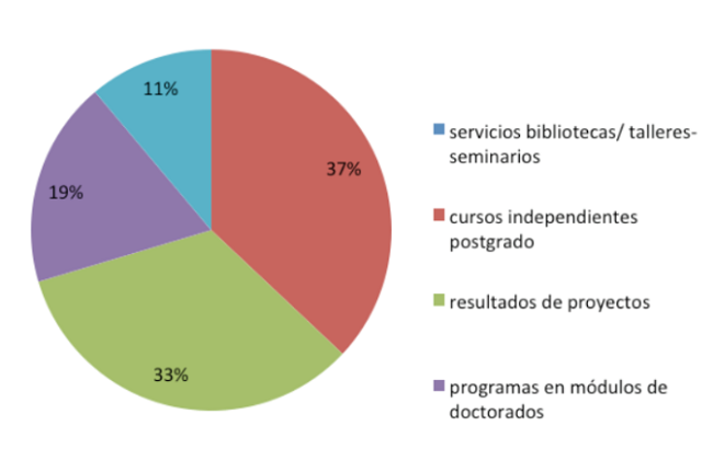 Durante la revisión bibliográfica se encontró una amplia variedad de materiales documentales que describían el desarrollo de habilidades en la formación doctoral representados en 19 países. Los mayores progresos se concentran en Europa, destacándose los países de Inglaterra, Gran Bretaña, España y Noruega. Se debe resaltar, también, a los Estados Unidos con un número significativo de resultados (Figura 1). Estas iniciativas se materializan en siete formas organizativas para aplicar sus propuestas: módulos de programas doctorales, cursos de postgrado, talleres abiertos de escuelas de doctores, talleres de proyectos de investigación, talleres-seminarios en eventos investigativos, actividades de orientación educativa desde servicios en bibliotecas, e intercambio de experiencias en redes sociales (blog temáticos). En la Figura 2 se muestra una relación de los más destacados.