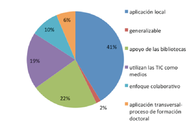 Del total de investigaciones, 14 cuentan con el apoyo de las bibliotecas de las instituciones; en 12 casos se utilizan las Tecnologías de la Información y de la Comunicación (TIC) como medios para desarrollar las iniciativas y seis están propuestas desde un enfoque colaborativo y en otros cuatro resultados se evidencia la aplicación transversal en todo el proceso de formación doctoral. La mayoría de estas investigaciones son de aplicación local, aunque una de ellas propone su generalización (Figura 3).