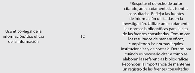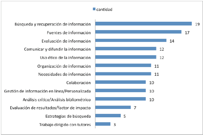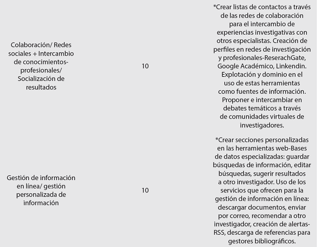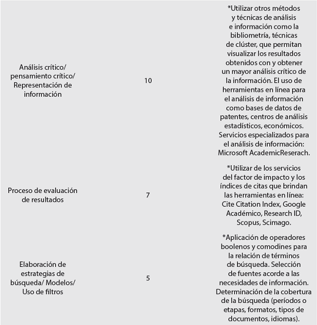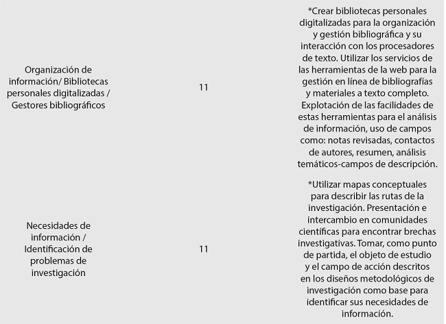 Existe una marcada tendencia a desarrollar las habilidades informacionales en la formación de doctores en niveles más avanzados de conocimientos como se muestra en la Tabla 2, donde se resumen las buenas prácticas obtenidas en diversas universidades y academias nacionales e internacionales.