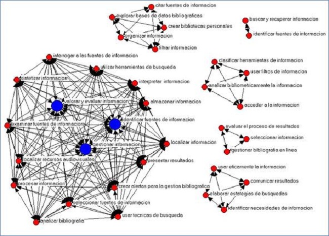 Se separaron los atributos que se describían en cada habilidad y se obtuvieron coincidencias con las habilidades informacionales que describe la ALA, por lo que, en su mayoría, están sustentadas bajo una misma concepción teórica (ver Figura 5, Figura 6 y Figura 7). La Figura 5 muestra los nodos de relaciones entre los atributos más coincidentes, sobresaliendo la identificación de fuentes de la información, evaluación de la información y gestión de la información (círculos azules), características asociadas principalmente con la búsqueda y la recuperación de la información.