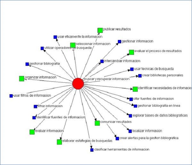 En la Figura 6 se extrajo el nodo de la habilidad informacional que mayores atributos descritos y relacionados entre sí presentaba: “buscar y recuperar información” (representado con círculo rojo) y sus atributos (representado con cuadros azules y verdes). Es importante señalar que los atributos son las características propias que distinguen cada habilidad informacional que, a su vez, pudieran verse unas veces como acciones y otras como operaciones propias.