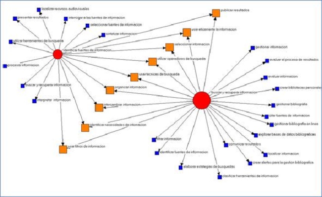 Los cuadros en color verde representan los puntos coincidentes de relación en la habilidad “buscar y recuperar información” con el resto de las habilidades informacionales que se trabajan y la coincidencia semántica y sintáctica de las habilidades informacionales de la ALA. En la Figura 7 se muestran los nodos de relaciones entre las dos habilidades informacionales más concurrentes (representado en círculos rojos) y los puntos coincidentes entre ellas (representado en cuadros naranjas). Se quiere resaltar que estas habilidades informacionales no se pueden aplicar de forma independiente, sino que conforman un grupo estrechamente relacionado en un sistema, donde contantemente es necesario, para realizar una acción u operación, regresar o ejecutar otra operación.
