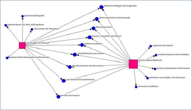 En cuanto a su aplicación y desarrollo, no todas las instituciones trabajan el total de habilidades informacionales, pero existe un consenso en cuanto a la profundidad con que se aplican y a la integración entre ellas (ver Figura 8). Se destacan las universidades de Babcock en Nigeria y Masaryk en República Checa, como las que mayores habilidades informacionales desarrollan en sus aspirantes a doctorado, con 14 y 13 respectivamente. En la Figura 8 se representa, en cuadros rosados, las universidades, en círculos azules las habilidades que utilizan, y los puntos coincidentes entre estas dos universidades.