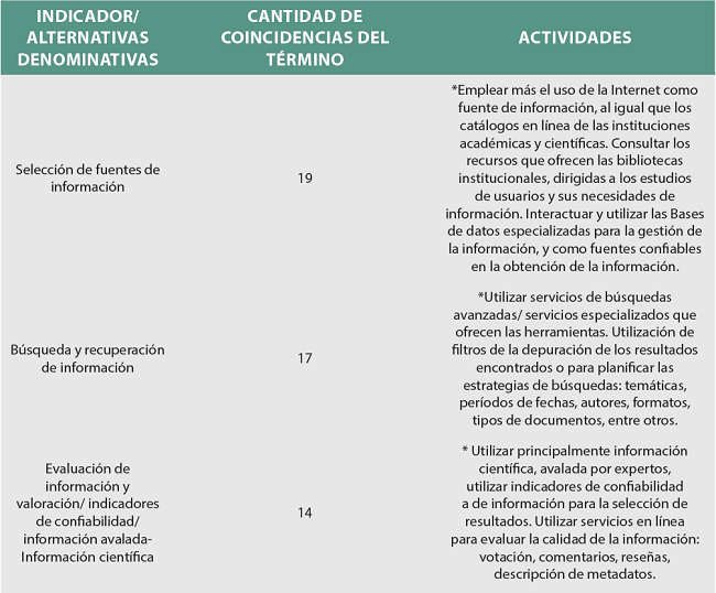 De igual manera, se utilizó la estadística descriptiva para presentar el análisis y la comparación de los datos obtenidos a través de gráficos y tablas utilizando el procesador de datos Excel. También, se aplicó el método bibliométrico para evaluar la coincidencia de atributos en cuatro indicadores fundamentales: 1) el uso de las habilidades informacionales, que describe la ALA como base de sus propuestas; 2) la aplicación y el desarrollo; 3) la denominación utilizada para cada habilidad, y 4) las habilidades aplicadas en cada institución.