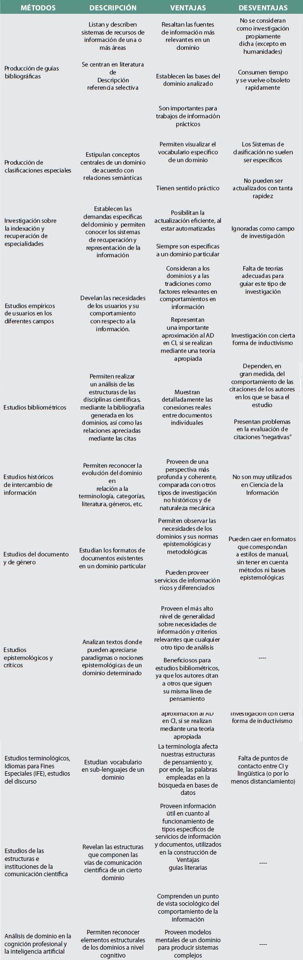 En la Tabla 1 ofrecemos una visión concisa de los enfoques del AD, según lo explicita Hjørland (2002) y sus principales ventajas y desventajas. Como se puede observar, el AD ofrece un conjunto de métodos que no están preconstituidos, no son inalterables, ni constituyen un único camino ya trazado, sino que son fácilmente adaptables y combinables entre sí, según las necesidades de cada estudio a realizar. Este holismo metodológico -o colectivismo metodológico, como prefiere denominarlo Hjørland-, constituyen aproximaciones o recomendaciones para incursionar en los dominios donde el propio investigador deberá hallar el trayecto más adecuado según el ámbito y la faceta a indagar, ya que “La aproximación analítica de dominio reconoce que los dominios discursivos comprenden actores que tienen cosmovisiones, estructuras de conocimiento individuales, sesgos, criterios de relevancia subjetiva, estilos cognitivos particulares, etc.”3 (Hjørland & Albrechtsen, 1995, p. 409). Este aspecto, indudablemente, se muestra prometedor para explotar el campo de la Ciencia de la Información, no solo en sus dimensiones aplicativas, sino en la progresiva construcción de sus redes teóricas internas y transdisciplinares y en el afianzamiento de sus bases filosóficas.