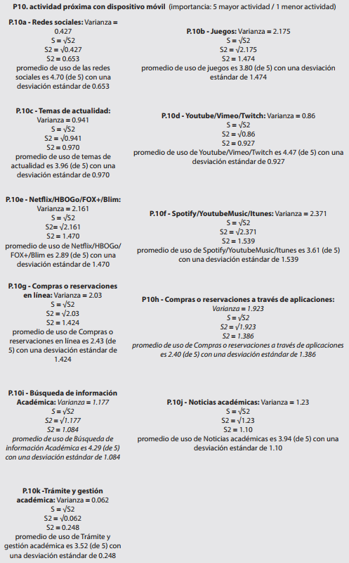 Además, se confirma que las actividades en dispositivos móviles con mayor recurrencia tienen un promedio por encima de 3.50 de valoración y son: redes sociales, videos (Youtube/Vimeo/Twitch), temas de actualidad, y trámite y gestión académica; en este rubro existen otras actividades que, aparentemente, superan el valor de 3.50, pero al contar con desviaciones estándar por encima de 1 se concluye que no tienen una valoración homogénea entre la comunidad.