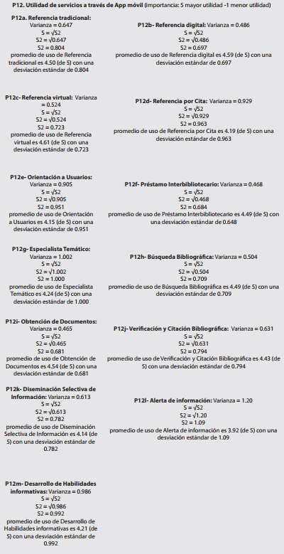 En el caso de los resultados de la pregunta P12 mostrados en la Tabla 2 (Anexo), referida a la utilidad de los servicios a través de dispositivos móviles, sus medidas de dispersión nos permiten clasificar los promedios de utilidad en dos rubros: en primer lugar, se toman en cuenta los promedios de importancia de servicios que cuenten con las medidas de dispersión por debajo del valor 1 (en los casos en que se observan resultados iguales se ordenan de menor a mayor medida de dispersión), encontrando un rango de dispersión de 0.648 a 0963, siendo estos los valores relativamente constantes. El orden de relevancia para los encuestados se establece de la siguiente manera: