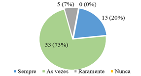 Observa-se pelo gráfico que a maior parte dos inquiridos (53 correspondente a 73%), nem sempre vê as suas necessidades satisfeitas quando procuram a BN. 20% dos inquiridos vê sempre as suas necessidades satisfeitas e 7% raramente tem as suas necessidades satisfeitas quando procura a BN.