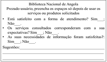 No caso, do sistema em estudo, a Biblioteca Nacional de Angola, pelos resultados obtidos da recolha dos dados, verificou-se que a mesma não realiza periodicamente estes estudos para aferir a satisfação dos seus usuários.