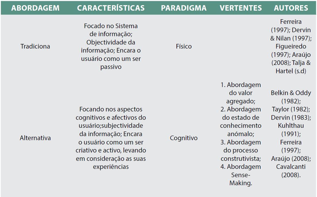 A mudança do referencial teórico da abordagem tradicional para a alternativa foi influenciada por vários factores. Araújo (2008) afirma que entre estes factores encontram-se a substituição da ideia de uma informação objectiva dotada de propriedades em si, para uma informação subjectiva cujas características existem apenas face a um sujeito específico. Para melhor compreender as duas abordagens de estudos de usuários da informação, foi elaborada uma tabela 1 , onde apresenta-se o resumo de cada uma delas e os autores que contribuíram para o seu desenvolvimento.