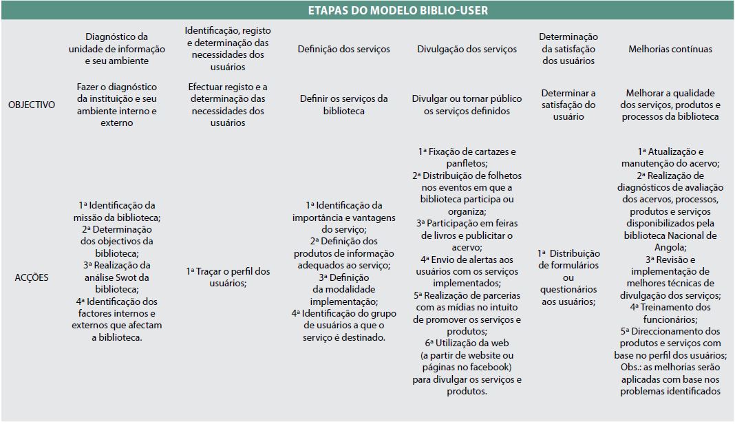 O modelo Biblio-User tem como o objectivo determinar as necessidades e o grau de satisfação dos usuários mediante os produtos e serviços da Biblioteca Nacional de Angola. A seguir, serão apresentadas e descritas cada uma das etapas que constituem este modelo.