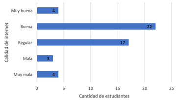 En este caso se puede apreciar que aproximadamente la mitad de las personas encuestadas tienen buena o muy buena calidad, mientras que la otra mitad cuentan con regular o mala conexión a internet. El hecho de que no se cuente con una buena conexión es un factor que incide en la experiencia de aprendizaje, ya que como lo refuerza Cotino (2020) el “internet es un nuevo paradigma y su acceso ha pasado a ser una necesidad esencial humana que debe estar garantizada como derecho humano y con protección constitucional (p. 12)”. Esta concepción del internet como una necesidad humana está presente en contexto del 2020 en donde la totalidad de las clases impartidas en la EBCI se dieron a través de medios virtuales.
