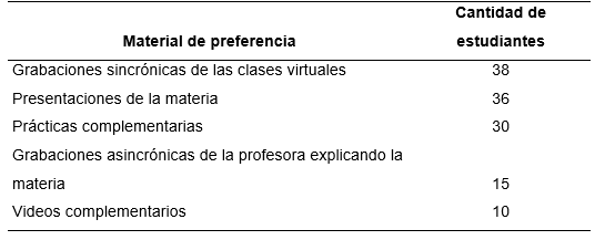 Relacionado con los materiales didácticos, se consultó cuáles fueron los más apropiados para comprender los contenidos, por lo que se puede visualizar que el material de preferencia fueron las grabaciones sincrónicas de las clases virtuales (ver tabla 2).
