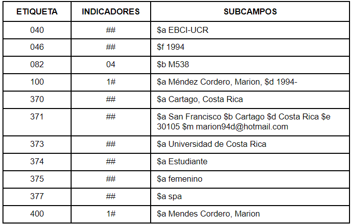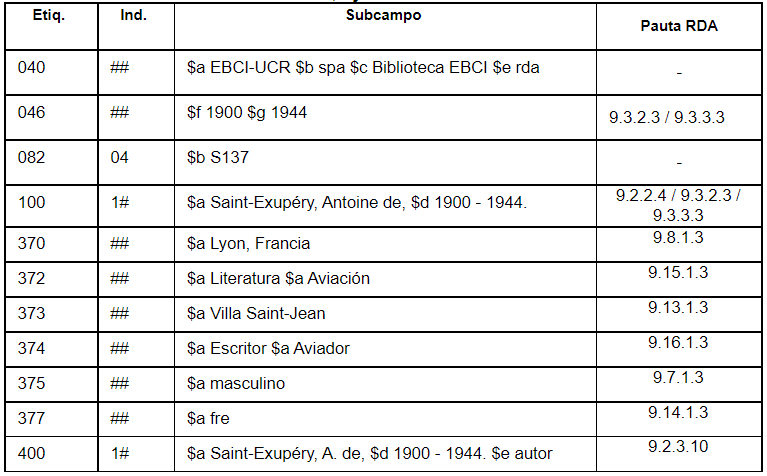 Unido a lo anterior, se crea una plantilla más específica para todos los registros de autoridades de autor, en donde se encuentran presentes las etiquetas, con sus indicadores y subcampos, similares a la Tabla 1, con la diferencia de que conforme se va avanzando en el estudio de las pautas de los capítulos 9, 10 y 11 de RDA (identificación de personas, familias y entidades corporativas), se realiza la equiparación de cada una de estas etiquetas con el número específico de pautas presentes en dichos capítulos, así como está presente en el ejemplo de la Tabla 2.