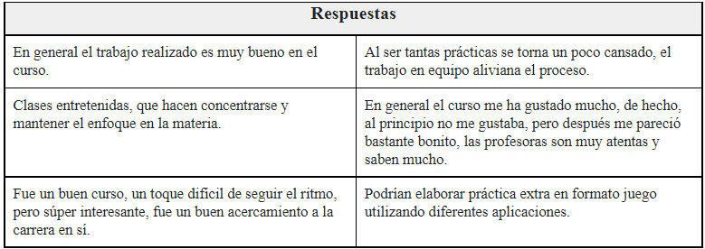 Dentro de las respuestas que se enlistan en la Tabla 4 se puede detallar que la metodología para el desarrollo de catálogos de autoridades utilizada propició de manera adecuada el cumplimiento de los objetivos didácticos de los cursos de catalogación, y permitió una mejor comprensión de estos. Respecto a la metodología lúdica, ésta propicia el desarrollo de habilidades blandas en las personas al mismo tiempo que se van estudiando los contenidos del curso, sin embargo, existen oportunidades de mejora como las mencionadas por los estudiantes respecto al manejo del tiempo y a las plataformas seleccionadas para los juegos.