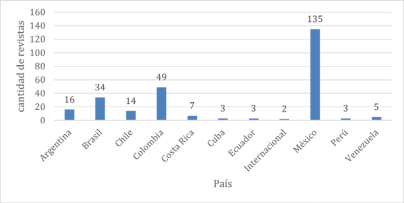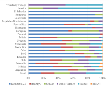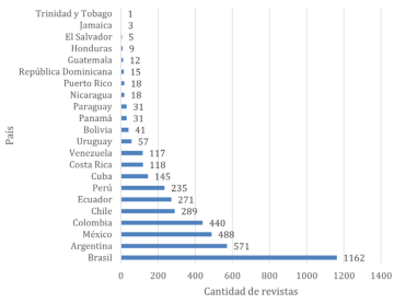 Cinco países engloban el 72.5 % de las revistas editadas. Pero es importante notar la presencia de países de la comunidad Andina, como Perú y Ecuador, de Centroamérica, como Costa Rica, incluso del Caribe, como Cuba, Puerto Rico y República Dominicana. Es decir, existen revistas de calidad en por lo menos 22 países de América Latina y el Caribe. La cantidad de revistas editadas es un indicador de los recursos disponibles y de la extensión institucional/territorial de las publicaciones. Al respecto, también debe considerarse en términos relativos a la base indexadora. Esto permite avanzar en interpretaciones desligadas del valor nominal de las revistas por país y ponderar la extensión regional de las bases indexadoras y su presencia en políticas nacionales o institucionales de indexación.
