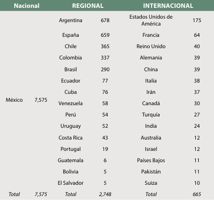 Para el caso de la Universidad Nacional Autónoma de México, la cantidad de autores mexicanos se acerca al 60 %, aunque sólo el 21 % tiene afiliación en la UNAM y poco más del 30 % de sus firmas son de autores de la región; las firmas internacionales son algo menos del 10 %; no obstante, esta entidad implica la mayor diversidad geográfica de firmas internacionales o del resto del mundo. Un comportamiento semejante, pero en escala menor puede apreciarse en las revistas de la Universidad Autónoma del Estado de México.