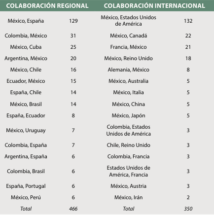 En la Tabla 9 y la Tabla 10 se observa la coincidencia de España y Estados Unidos de América como los países que más publican en estas revistas sin colaboración y también como los países que más han publicado en colaboración con México.