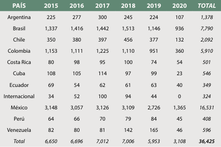 Considerando la distribución de los documentos por país de edición, las revistas de México obviamente mantienen el liderazgo con 16 531 artículos indexados. Pese a ello, el segundo país en volumen de publicación es Brasil con 7790 artículos, mientras Colombia lo sigue con 5910 artículos, lo que invierte lo mostrado en la Figura 3.