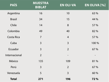 La comparación de la cobertura de las publicaciones en Biblat se hizo sobre la base de una muestra de 271 revistas que presentaron los metadatos más completos y actualizados al momento de extracción (enero de 2022). Estas 271 revistas publicaron 36 425 artículos entre 2015 y 2020, indexados en Biblat. A partir de la descripción estadística de esa muestra y de las características de los documentos en referencia a país e idioma de publicación, interesa caracterizar su relación con la base de datos OLIVA a fin de destacar la cobertura única de Biblat-Latindex frente a lo que se considera la producción indexada de América Latina y su potencial para explorar y analizar datos de la producción de documentos a nivel regional.