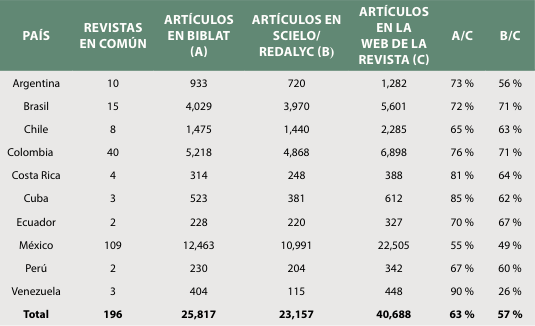 Del cruce entre las 271 revistas de la muestra Biblat y los 1720 títulos en OLIVA, que incluye revistas indexadas en SciELO y RedALyC, se encontraron 196 revistas (72 %) en común, según se presenta en la Tabla 2. Los países con mayor porcentaje de coincidencia entre las dos bases son Cuba (100 %), seguido por Colombia (82 %) y México (81 %). En contrapartida, es menor la cobertura en el caso de las revistas de Brasil, Argentina, Chile, Venezuela y Costa Rica, donde no supera el 63 %. Esto sugiere una marcada inversión en las estrategias editoriales de estos países al indexar en SciELO o RedALyC antes que en Biblat. En ello pueden incidir multitud de factores, pero uno relevante parece ser el que explica las revistas brasileras. En dicho caso, no sólo influye que se trate del país de origen de SciELO (tal como sucede en las iniciativas con base en México y las revistas del mismo país), sino también sucede que la cantidad de revistas editadas en Brasil excede a las de cualquier otro país de la región, por ende, el numerador respecto del cual se calcula cualquier proporción tiende a disminuir el valor final más notoriamente que en otros casos.