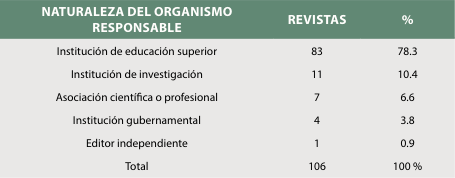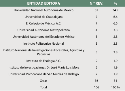 Las 106 revistas del conjunto son editadas por 46 entidades diferentes, principalmente instituciones educativas de educación superior; la Universidad Nacional Autónoma de México, como se observa en la Tabla 6, edita el 34.9 % de las revistas de esta muestra.