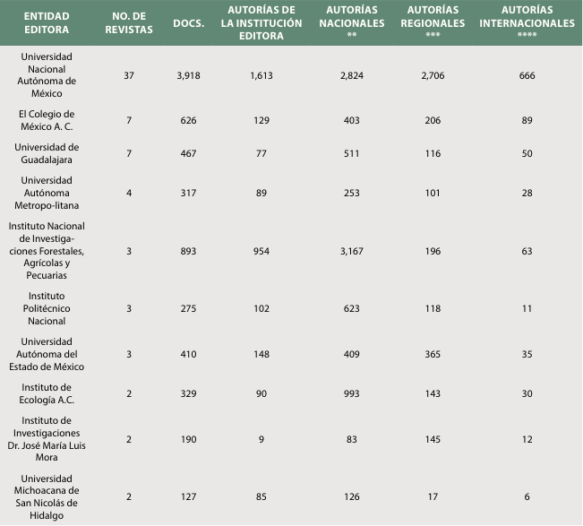 Las revistas de otros centros de educación superior como la Universidad de Guadalajara, la Universidad Autónoma Metropolitana y el Instituto Politécnico Nacional publicaron documentos, en los cuales, más del 70 % de las firmas son de autores mexicanos; con todo, las afiliaciones correspondientes a la entidad editora, en todos los casos, no superan el 20 %. En el caso de las revistas del Instituto Nacional de Investigaciones Forestales, Agrícolas y Pecuarias y del Instituto de Ecología A. C., estos publican resultados de las investigaciones de sectores temáticos específicos, probablemente de mayor relevancia local, en esta muestra más del 80 % son de autores mexicanos.