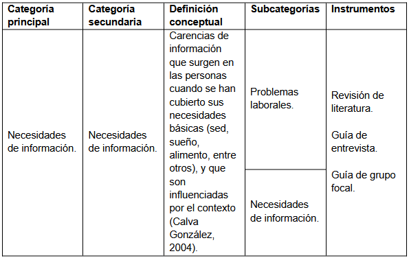 Para el análisis de la información recolectada, se planteó una categoría principal de estudio: las “necesidades de información”. La primera categoría secundaría que se asignó también lleva este mismo nombre y se divide en las subcategorías de “problemas laborales” y “necesidades de información”. Se planteó esta categoría principal porque las necesidades de información representan la base del surgimiento del comportamiento o de las prácticas informacionales. Por esta razón, la misma categoría se convierte en categoría secundaria y en subcategoría a su vez, ya que antes del surgimiento de las necesidades de información se presentan los problemas laborales, mismos que desembocan en necesidades. La Tabla 1 muestra esta categorización.