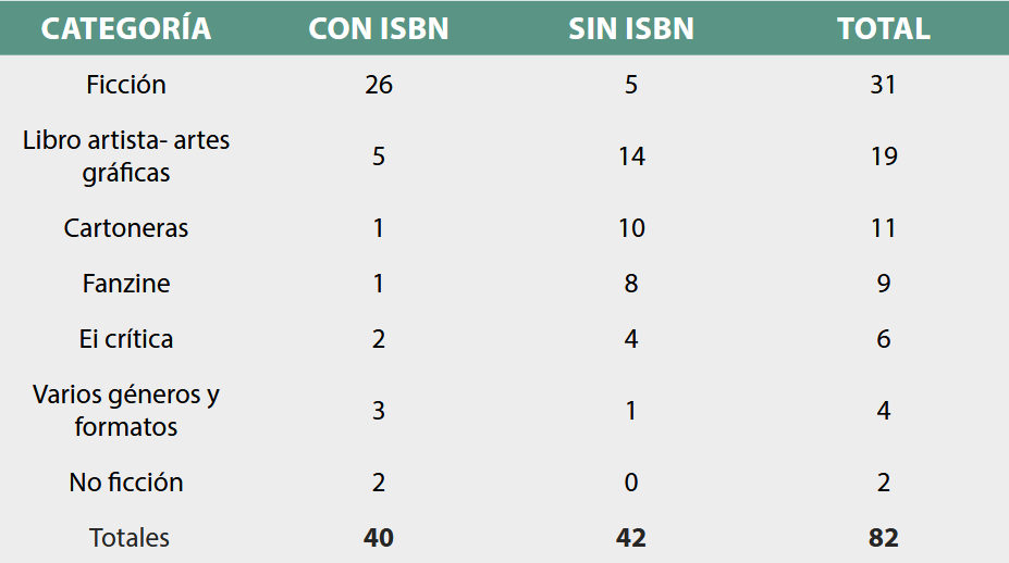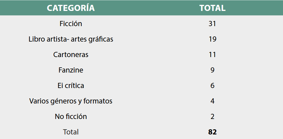 En tercer lugar, a partir de la caracterización de los proyectos se hizo una clasificación, agrupándolos por el enfoque editorial principal que guía sus prácticas, según las descripciones del proyecto en sus catálogos o páginas web3, como se muestra en la Tabla 1. Las categorías son: ficción (quienes publican principalmente novela, cuento, poesía y teatro en formatos no experimentales del libro); libro artista-artes gráficas (quienes tienen como criterio principal publicar libros-objeto, libros que juegan con su propia materialidad y donde lo artístico y lo bibliográfico son una misma cosa); cartoneras (libros artesanales publicados con materiales como el cartón, lo cual implica una postura política frente al quehacer editorial); fanzines (autopublicaciones de corta tirada, creadas por y para aficionados de un tema en concreto); edición independiente crítica (proyectos claramente oposicionales a los órdenes hegemónicos, que publican principalmente temas relacionados con movimientos sociales en formatos no experimentales4); no ficción (editoriales que publican ensayo, crónica, perfiles en formatos no experimentales); varios géneros y formatos (editoriales que no presentan un criterio rector de sus publicaciones).