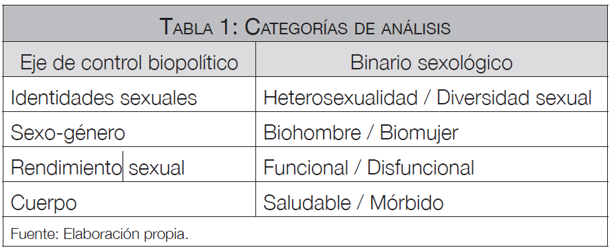 Por su parte, se generó un conjunto de categorías ex post facto, en función de la sistematización del material de análisis. Se identificaron de esta forma ejes de control biopolítico que se decantasen por una aprehensión de la sexualidad bajo un esquema binarizado. En el cuadro que aparece a continuación se muestra dicha configuración:
