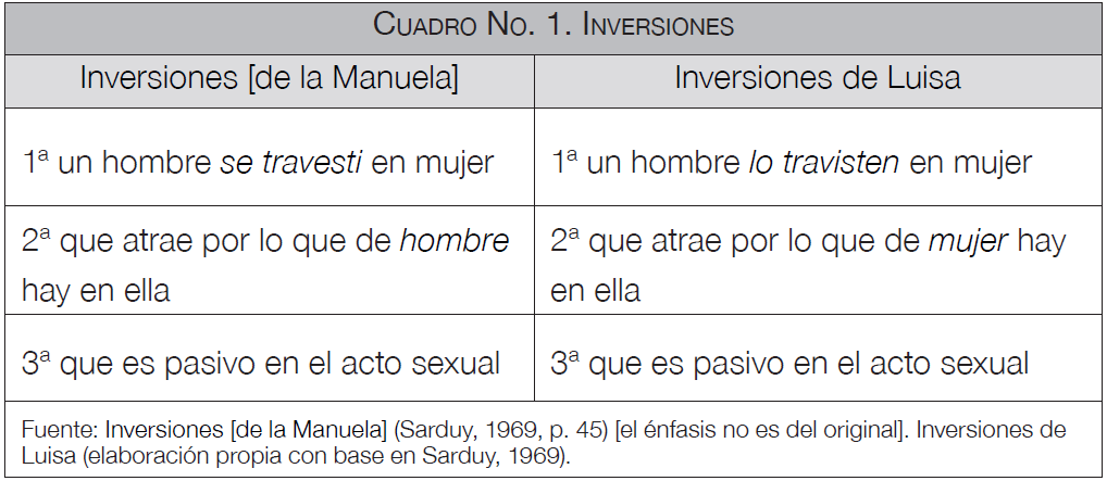 Solamente la última inversión concuerda con el gráfico de Luisa adaptado con base en el diseño de Sarduy. En El lugar sin límites, la decisión de travestirse es unánime; es decir, la Manuela lo hace porque quiere y está consciente del acto. Al contrario, Luisa, en el “La corrección de menores (Manuscrito de un escolar)”, se ve travestido obligatoriamente por otro personaje que representa la autoridad sobre el cuerpo del personaje principal: