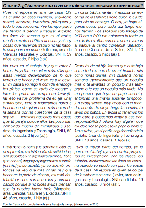 En el Cuadro 3 se exponen algunas reflexiones de las y los investigadores sobre la conciliación de la vida personal con la vida científica-laboral, con estas se da cuenta que sigue sin existir una verdadera corresponsabilidad en el ámbito privado, los hombres como puede leerse toman una parte de las responsabilidades del hogar, es decir, apoyan circunstancialmente pero no se corresponsabilizan por completo, incluso los hombres como recurso para la sustitución de su responsabilidad en el hogar, buscan ayuda externa y es así como el papel de las mujeres en el ámbito privado se perpetúa.