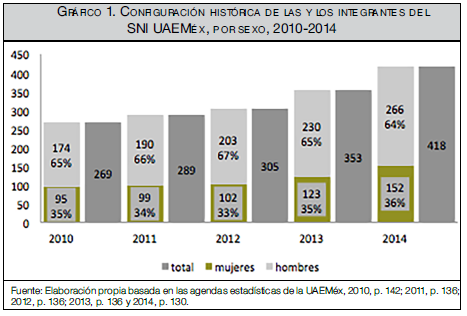 En el ciclo 2014-2015 la UAEMéx (corte hasta julio 2015) registró en el SNI 96 candidatas y candidatos a investigador nacional, de los cuales 35 son mujeres y 61 son hombres. En el nivel I hay 280, de los cuales 107 son investigadoras y 173 son investigadores; en el nivel II existen 38, de ellos 30 son hombres y solo 8 son mujeres, y únicamente hay 4 en el nivel III: 2 investigadoras y 2 investigadores.