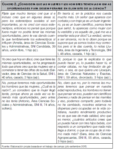 La manera en que se decidió ahondar sobre los estereotipos en la ciencia durante las charlas con las y los investigadores, comenzó con un cuestionamiento crucial: ¿considera que las mujeres y los hombres tienen las mismas oportunidades para desempeñarse en el ámbito de la ciencia? De los 14 personas entrevistadas, cinco de seis investigadores dijeron que sí; y siete de las ocho investigadoras consideraron que las oportunidades son desiguales. Es verdad que cada vez encontramos a más mujeres presentes en actividades académico-científicas; sin embargo, en qué circunstancias las mujeres están ingresando a estas labores. Algunas reflexiones sobre el tema se presentan en el Cuadro 2. A partir de ellas, podemos argumentar que uno de los elementos fundamentales que influye de manera importante en que las investigadoras consideren que tienen menos oportunidades para su desarrollo y consolidación está directamente vinculado con la reproducción de estereotipos sociales.